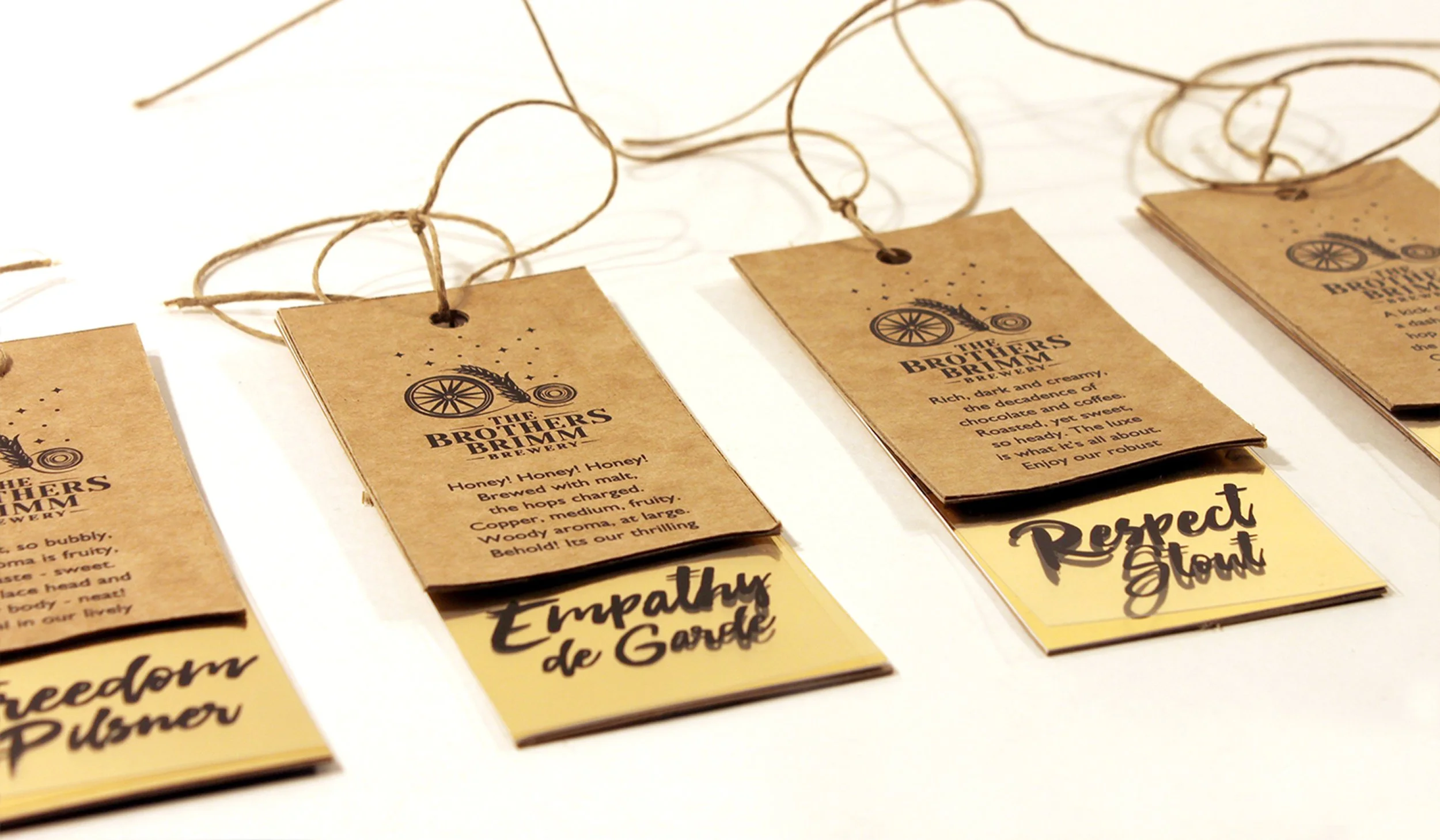 A tag tied to the growler reveals the name of the beer in the structure of a poem just as Rumpelstiltskin reveals his name in the story. The tag itself is made of bookbinding board and twine, retaining the physical familiarity of a story book. The reflective material that contrasts the rawness of the cardboard continues to resonate the relationship between humility and pride.