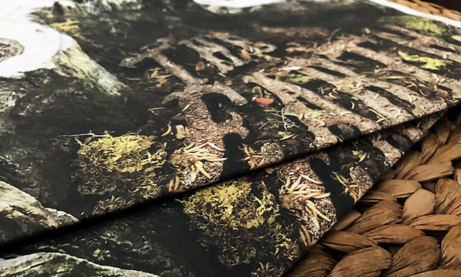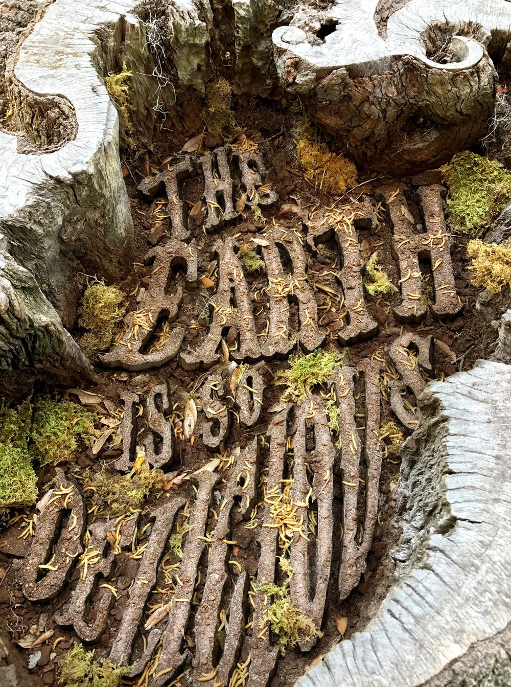 Cover art using a quote was constructed in place - within the hollow of a cut-down tree at the local park. The type was cut out of blue foam and placed within the space. It was then covered with dirt, fresh moss, and finally worms to bring it to life.